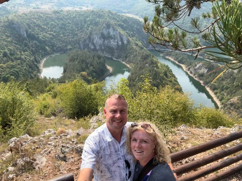 Het laatste stuk moeten we over een onverharde weg en we hotsen en klotsen heen en weer. Daarna hobbelen we met de benenwagen over een schots en scheef paadje om vervolgens verrast te worden met dit prachtige uitzicht van Meandri Cehotine. En als je de Amerikaanse Horseshoe Bend mooi vindt dan is dit echt nog even een overtreffende trap. Werkelijk schitterend.