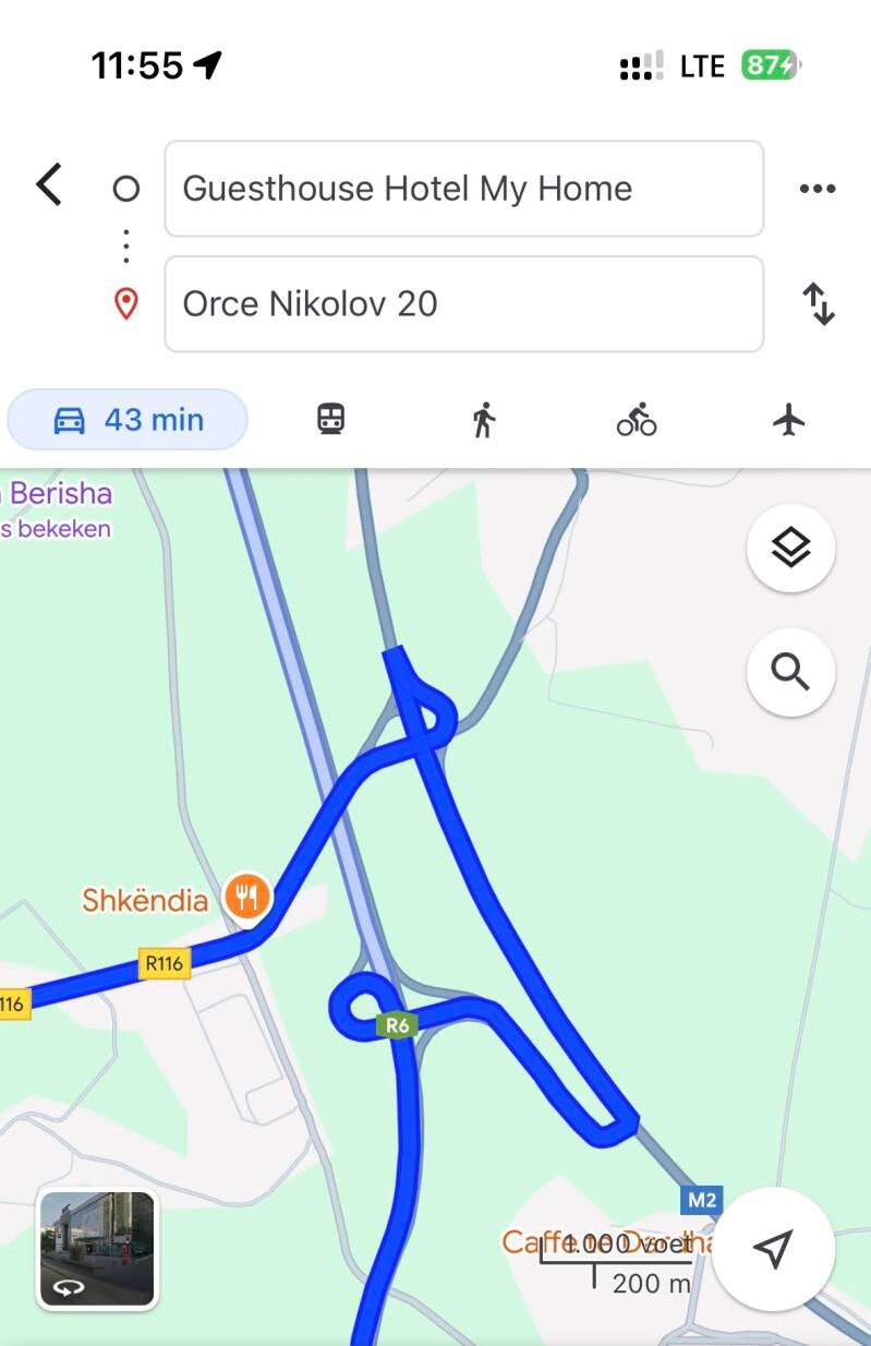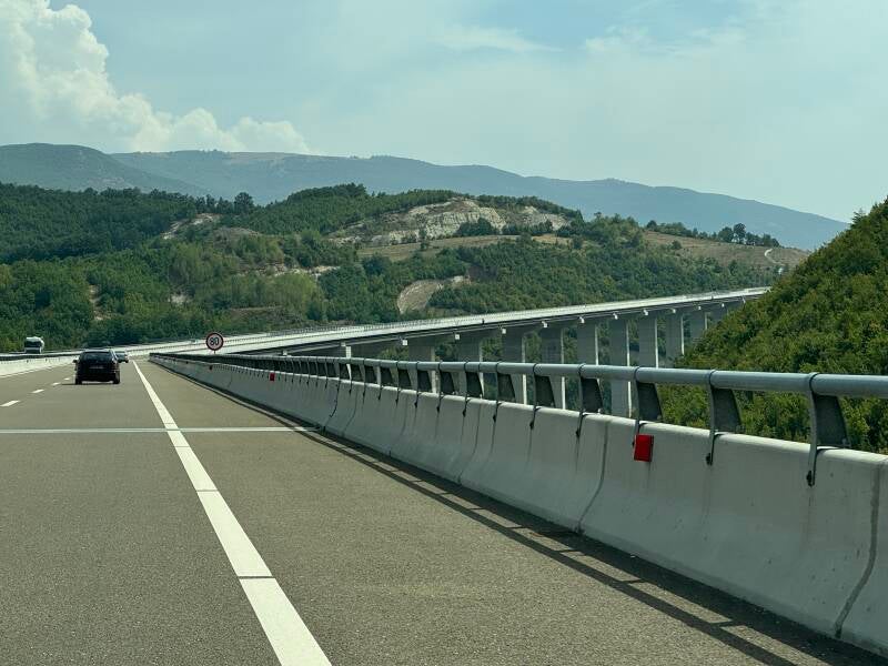 Op een gegeven moment rijden we in een dal over een kilometers lange snelweg gebouwd op palen, dat voelt wel bijzonder idee en dito uitzicht. Nadat we uit de bergen weer op vlak land rijden, moeten we een wel hele rare route volgen om op de volgende snelweg te komen (zie blauwe lijn op onderstaande foto. Foutje van Google? Nee hoor, we moeten echt kronkelen maar komen uiteindelijk op de juiste snelweg terecht.