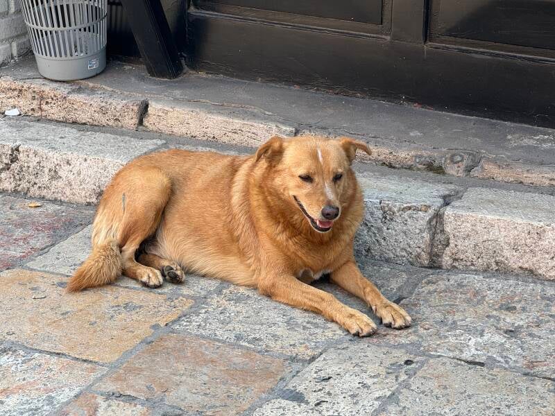De lunch is overdadig en we houden worstjes over. Die verdwijnen in de tas van Renate. Ze hoopt dat ze haar trouwe fan vanmiddag nog tegenkomt, dan krijgt hij de worst. We wandelen rustig terug naar het appartement om het tweede wasje erin te gooien. Het drogen van de was, aan een rekje op het balkon gaat hier echt als een jekko.