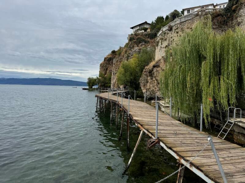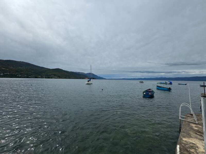 In de buurt van het water gaan we op zoek naar een ontbijttentje en we vinden er een, Kajche. En laat dat nu ook een de door de gids in Skopje aangeraden eetgelegenheid zijn waar we vanavond ook een vorkje gaan prikken. Toeval bestaat niet. En daarnaast is het zo'n beetje het enige tentje dat op dit moment open is en ontbijt serveert. We worden vriendelijk geholpen terwijl we binnen achter het raam zitten. Een oude baas is druk bezig om het terras aan het water droog te zemen. Ik kijk er wat meewarig naar gezien de voorspelde regen. Maar in de loop van ons verblijf blijkt dat de oude baas het goed gezien heeft. Het terras stroomt steeds voller met gasten en het blijft gewoon droog! Het uitzicht vanuit dit restaurant over het meer is prachtig en het ontbijt is heerlijk.