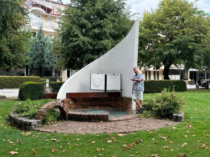 We rijden weer terug richting Ohrid en gaan op weg naar de laatste stop. Het momument voor de Nederlandse schrijver A. den Doolaard. En dan vraag je je natuurlijk af, huh, waarom heeft hij hier een momument? Nou, hij heeft heel veel gereisd door voormalig Joegoslavië en ook door Macedonië en daarover veel geschreven en naar verwezen in zijn boeken. En dit was voldoende aanleiding voor de Nederlandse Kamer van Koophandel hier in Macedonië om een monument aan hem te wijden. We schieten snel wat plaatjes en gaan op weg naar een bakkie. Dit drinken we in het übertoeristische deel van Ohrid. Hier is het echt mega, mega druk. En dus blijkt dat Ohrid geweldig mooi is, op een prachtige locatie ligt, maar al die toeristen... (nogmaals, dit geldt niet voor ons).