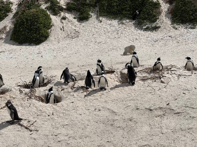 Een uurtje later staan we tussen de toeristen bij Boulders Beach. En eerlijk: het is druk, maar die pinguïns zijn té leuk. Waggelend, kwetterend, fotogeniek — ik zou er zo eentje meenemen als huisdier. Wel vragen we ons af wie bekijkt nu eigenlijk wie? En wie is er hier gek? De toeristen (wij natuurlijk niet) of de pinguïns?