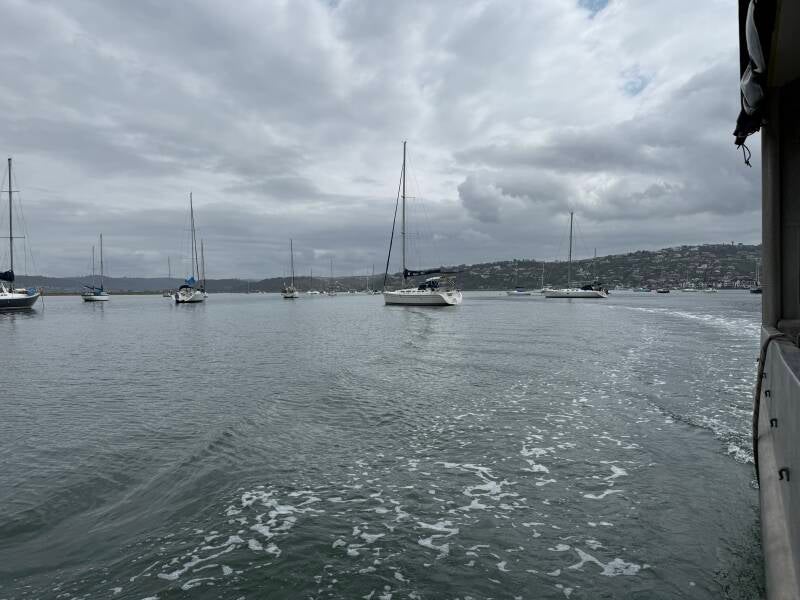 Beneden wacht ons een heerlijke lunch. Verse salades, warm eten en – halleluja – Malva pudding, mijn persoonlijke Zuid-Afrikaanse verslaving. Het eten is goed, de sfeer gemoedelijk, en voor we het weten is het drie uur. Tijd om terug te varen.
