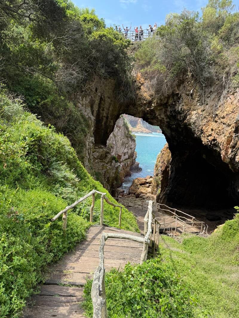 Het ritje naar Knysna verloopt soepel. We droppen eerst onze koffers bij het guesthouse, zodat we met een gerust hart binnen een paar minuten weer door kunnen. Het guesthouse ligt charmant tegen een heuvel aan, en vanaf ons balkon hebben we een uitzicht dat zó ansichtkaartwaardig is dat je bijna zou vergeten dat je er zelf bent.