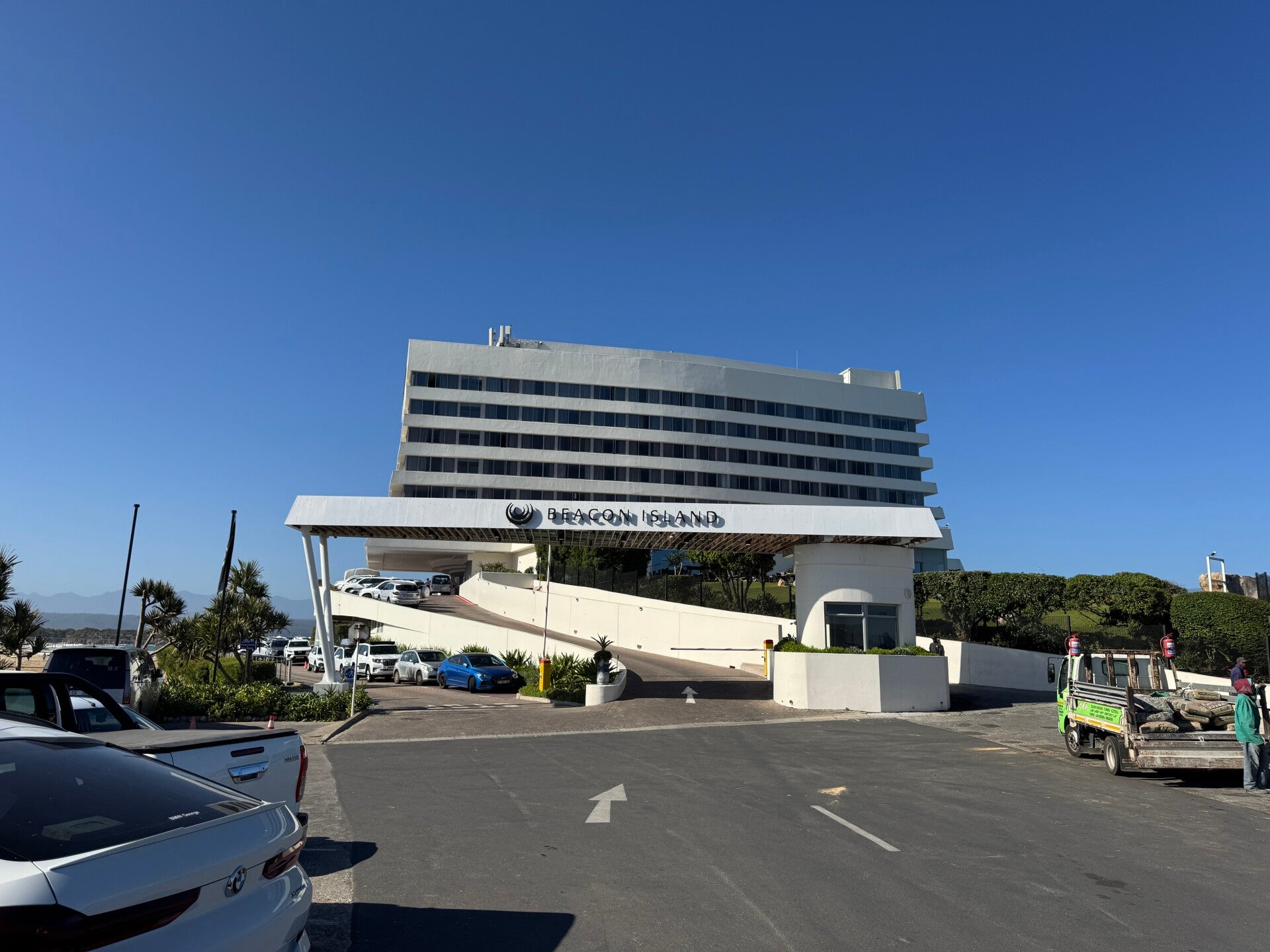Na het uitpakken gaan we even koffiedrinken bij het Beacon Resort, een hotel dat eruitziet als een kruising tussen een cruiseschip en een postkantoor uit 1922. Foeilelijk, maar de koffie is top en het uitzicht op de baai maakt veel goed.