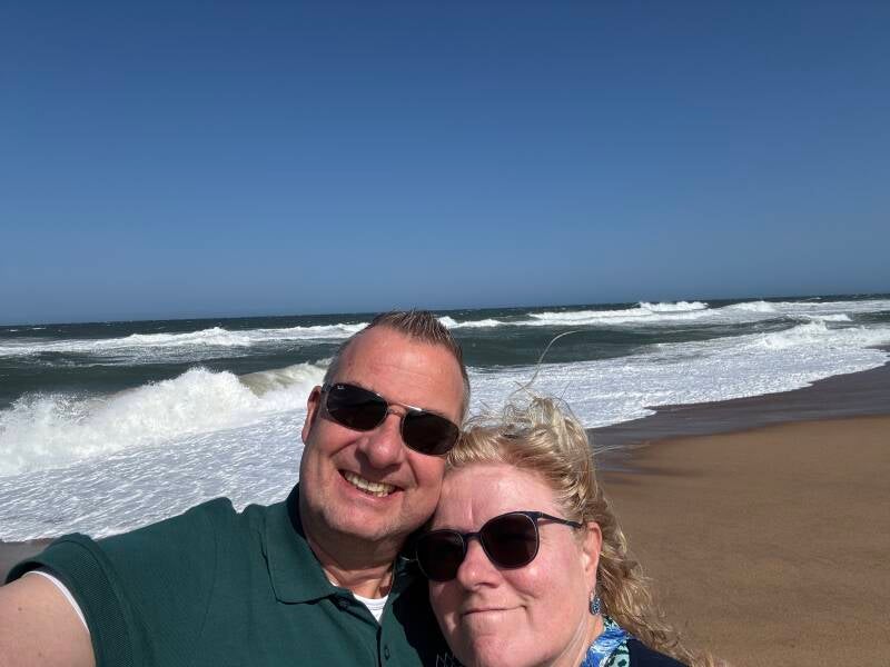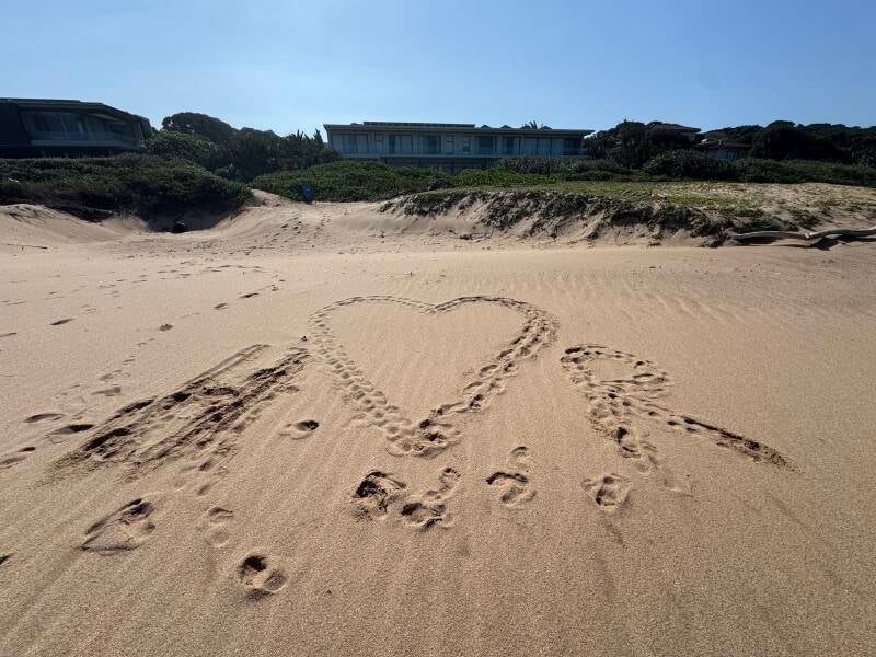 We pikken onze auto op en zwaaien nog even vrolijk en vriendelijk naar de parkeerwachter. Een grote glimlach is ons deel. Maison H. Klinkt als een Franse erotische thriller, maar nee hoor, gewoon een chique villa met tralies voor de ramen. Romantiek én gevangenisgevoel in één pakket. Echt een mooie plek. Je loopt in een paar minuten naar het strand. Helaas stond er een straffe wind, dus we kregen meteen een gratis zandstraalbehandeling. De zee is behoorlijk onstuimig. Uiteraard moet ik even met de voetjes in het water van de Indische Oceaan en laat ik de romantiek nog even uit mijn voeten komen.