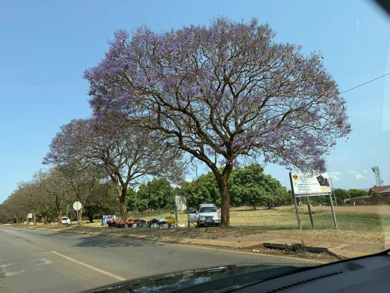 Via Lydenburg rijden we door. Plots zie ik ze: jacarandabomen in volle paarse bloei. Niet zo massaal als in Pretoria, maar wát een feestje.