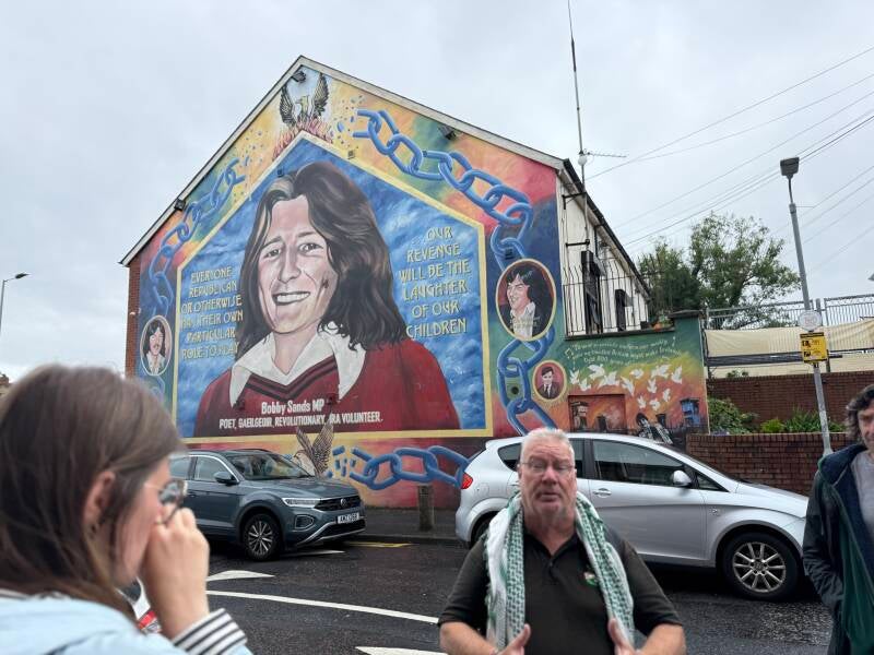 We krijgen eerst een rondleiding van een voormalig lid van de IRA (nationalist) en die 16 jaar in de gevangenis heeft gezeten, alleen, naar eigen zeggen, omdat hij een aanslag op een unionist aan het voorbereiden was. Of hij niet meer op zijn kerfstok had wordt in ieder geval niet helemaal duidelijk. Hieronder zie je hem staan voor een afbeelding van een van de 'vrijheidsstrijders' van de IRA, Bobby Sands. Bobby werd zwaar gestraft na een vuurgevecht met de politie en besloot na een tijd in hongerstaking te gaan als protest tegen de slechte omstandigheden in de gevangenis. Hij overleed na 66 dagen.