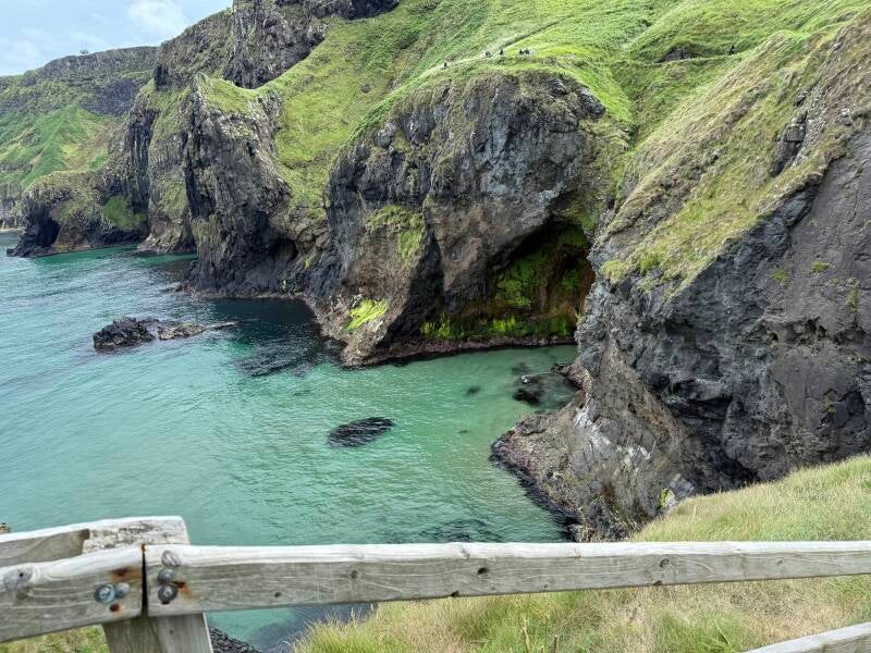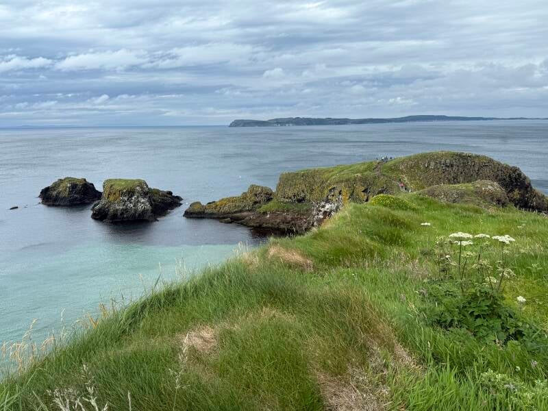 Daarna door naar de touwbrug bij Carrick-a-Rede. Ook hier weer adembenemend mooi, maar de entreeprijs doet ons even slikken: 30 pond voor een wandeling van 2 km heen en terug. We verwachtten bijna een golfkarretje en champagne, maar helaas, gewoon lopen. Toch de moeite waard.
