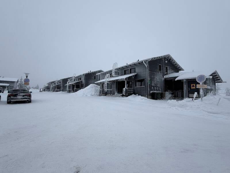 Na ongeveer 1,5 uur rijden komen we aan op de plaats van bestemming. Hotel Iso Syöte in het gelijknamige gebied Iso Syöte. Het is een prachtig hotel boven op een flinke molshoop (423m hoog). Op de foto links de opgang naar de receptie, op de foto rechts een aantal bungalows voor 6 personen (nee, zoveel persoonlijkheden hebben wij niet bij ons).