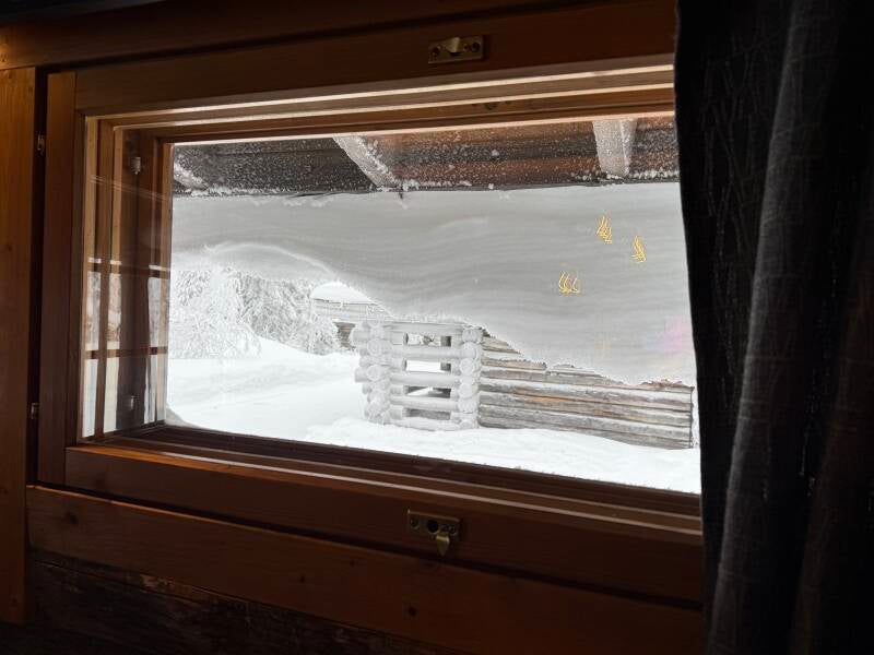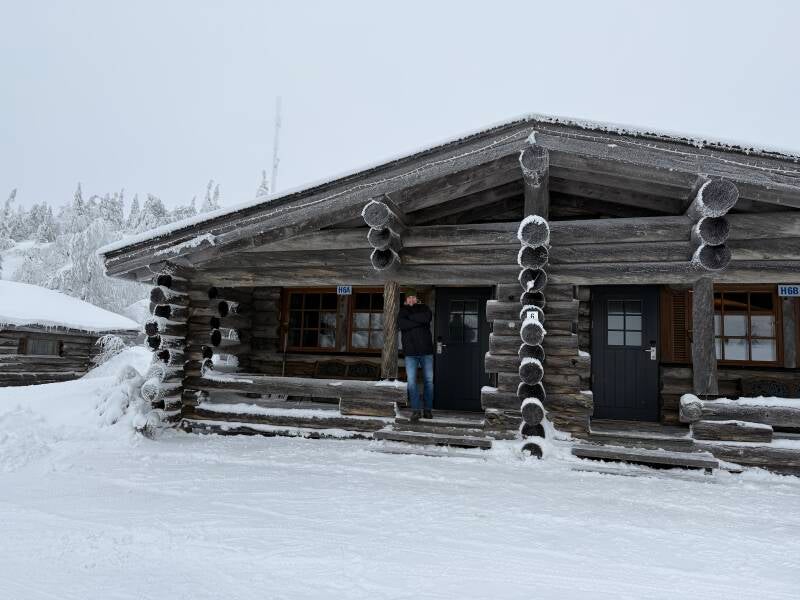 Om 13.00u zijn we in onze blokhut. We hebben geluk, van dit type blokhut ligt de onze het dichtst bij het hotel. Maakt ons niet minder zielig hoor, blijft nog steeds heel sneu voor ons dat we ons een weg moeten ploegen naar ons ontbijt en diner in het hotel. Maar waarom hebben we dan gekozen voor een hut? Nou, we hebben hier meer ruimte, EN een tafel, EN een lekkere stoel EN ook nog eens een bank. Dat hebben al die hotelkamers niet. En aangezien het hier overdag 'maar' 7 uurtjes licht is, denken we dat we ook wel wat uurtjes in de hut doorbrengen. Het interieur is erg knus en rustiek en het uitzicht is prachtig. Op onderstaande foto is het linkerdeel waar wij verblijven.