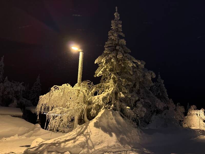 Nadat we de koffers hebben uitgepakt en even een cup-a-soup hebben weggekopt kleden we ons lekker dik aan en gaan we de omgeving verkennen. En hier zien we dan een mooi fenomeen wat ze 'Marshmallow bomen' noemen. De bomen zitten onder onder zo'n dikke laag sneeuw dat deze vastvriest aan de takken.