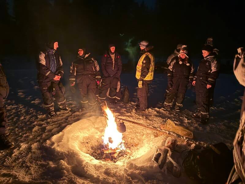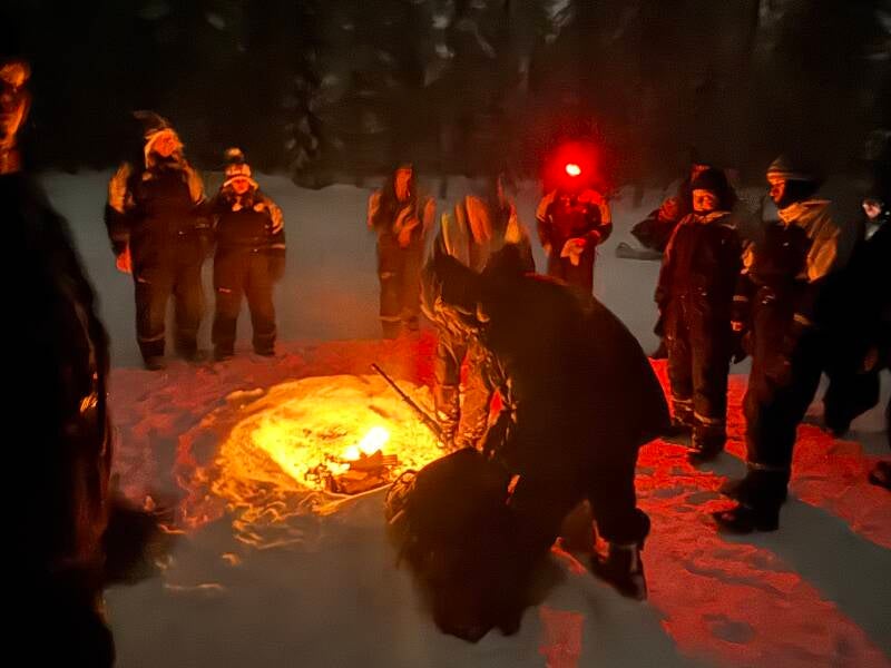 Na ruim een half uur rijden stoppen we midden in het bos. Hier gaan we het noorderlicht bekijken. Er wordt een houtvuur gestookt en we krijgen een warm drankje (soort warme ranja of koffie). We turen en we turen maar het is echt te bewolkt om ook maar iets te kunnen zien wat in de verste verte door kan gaan voor het noorderlicht. Maar dan schieten we hier wel een paar leuke kiekjes. Paola en Renate zijn besties for life! Fijn dat Renate d'r bril ook boven de oren gewoon blijft zitten!