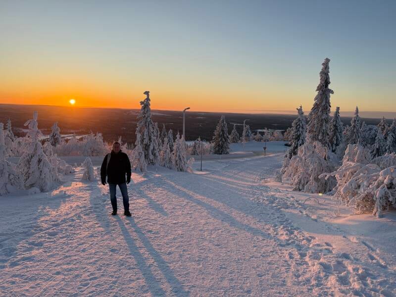 Dit mooie heldere weer belooft iets of zelfs veel goeds voor de kansen op het noorderlicht vanavond. Maar ja, net zoals in Nederland kan het weer hier ook redelijk snel omslaan. Maar we blijven optimistisch! Na zo'n 3,5 km ploeteren door de sneeuw, pakken we een kopje koffie in het restaurant van het hotel. Het is hier al met al nog niet eens zo heel druk met toeristen, vanaf a.s. weekend hebben de Finnen vakantie, dus dan verwacht het hotel enorme drukte. 'Gelukkig' maken wij dat vanaf zondag niet meer mee.