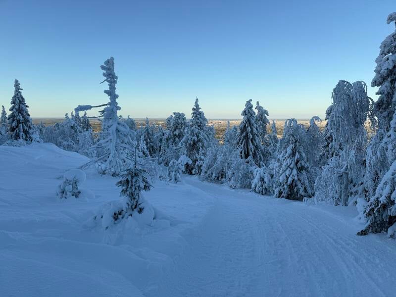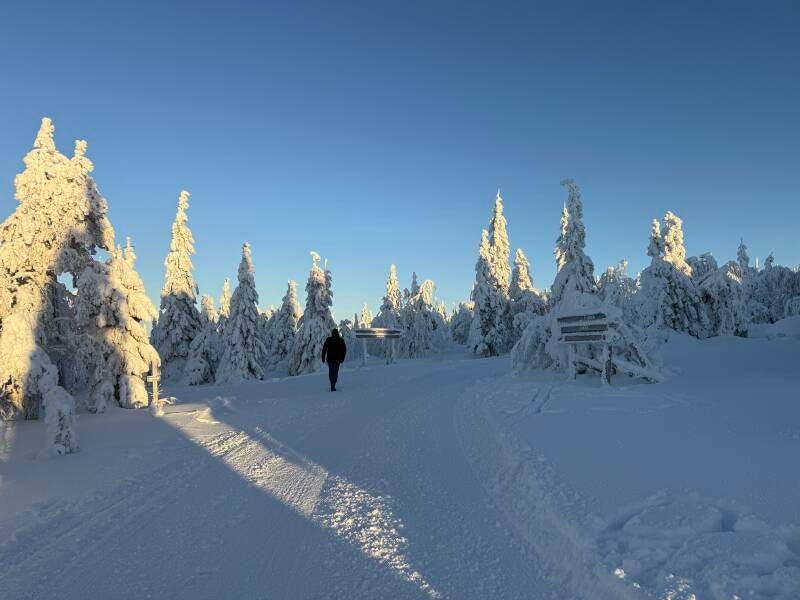 Misschien wordt het voor jullie lezers wel saai, al die foto's van bomen onder het sneeuw, maar wij kunnen er geen genoeg van krijgen. En natuurlijk volgen we netjes de borden met vollllledig onbegrijpelijke teksten, zoals hieronder: Huippupoiki! We denken dat het iets is met wandelen, pas op voor de gladheid, wolven en beren of zo.