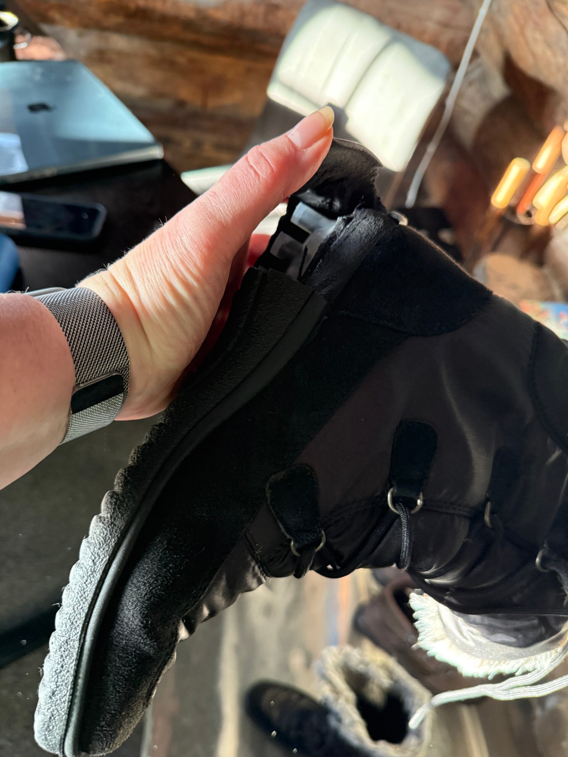 Nog voordat we vertrekken voor onze excursie, merk ik dat mijn snowboots nu al het loodje hebben gelegd. Ze waren nog nieuw toen ik ze meenam! Zo zien jullie maar weer onder welke erbarmelijke omstandigheden wij ons hier bevinden en hoe ontzettend zwaar wij het hebben, zelfs de snowboots geven het na een paar dagen al op. Gelukkig hebben we nog de oversized laarzen van het hotel en ik heb nog mijn 'gewone' wandelschoenen mee. Dus nee, jullie hoeven geen schoenen naar Lapland te sturen!