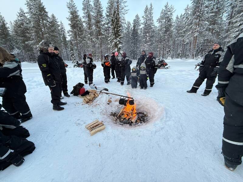 Om 14u staan we met bijna 30 personen klaar voor de sneeuwscootersafari. De zon schijnt gelukkig wel, maar het is -10 graden, dus we zijn weer dik ingepakt.