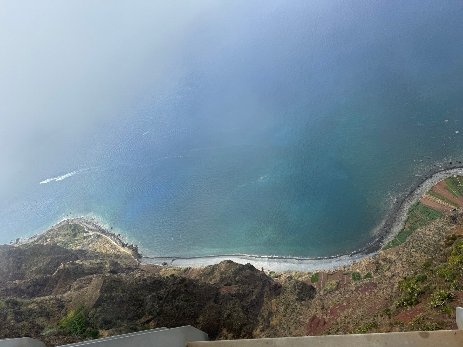 Maar eerst langs nog een laatste uitzichtplatform met glazen bodem, de Cabo Girao skywalk, bij Funchal. Op 581 meter hoogte, dus de toet moet weer even zijn paardenkracht laten zien. En dat doet ie goed. En terwijl we dichterbij komen, komen we in de wolken/mist terecht. Altijd leuk als je voor het uitzicht gaat… Dat werd dus niet echt wat. Kostte ook nog eens 2 euro pp! Wel nog een kiekje kunnen maken van het strand 581 meter benee.